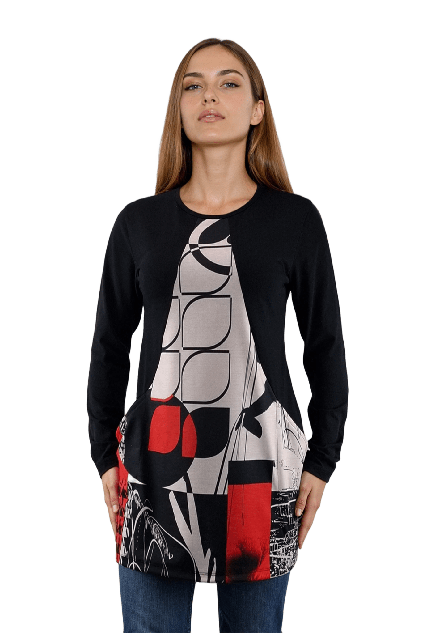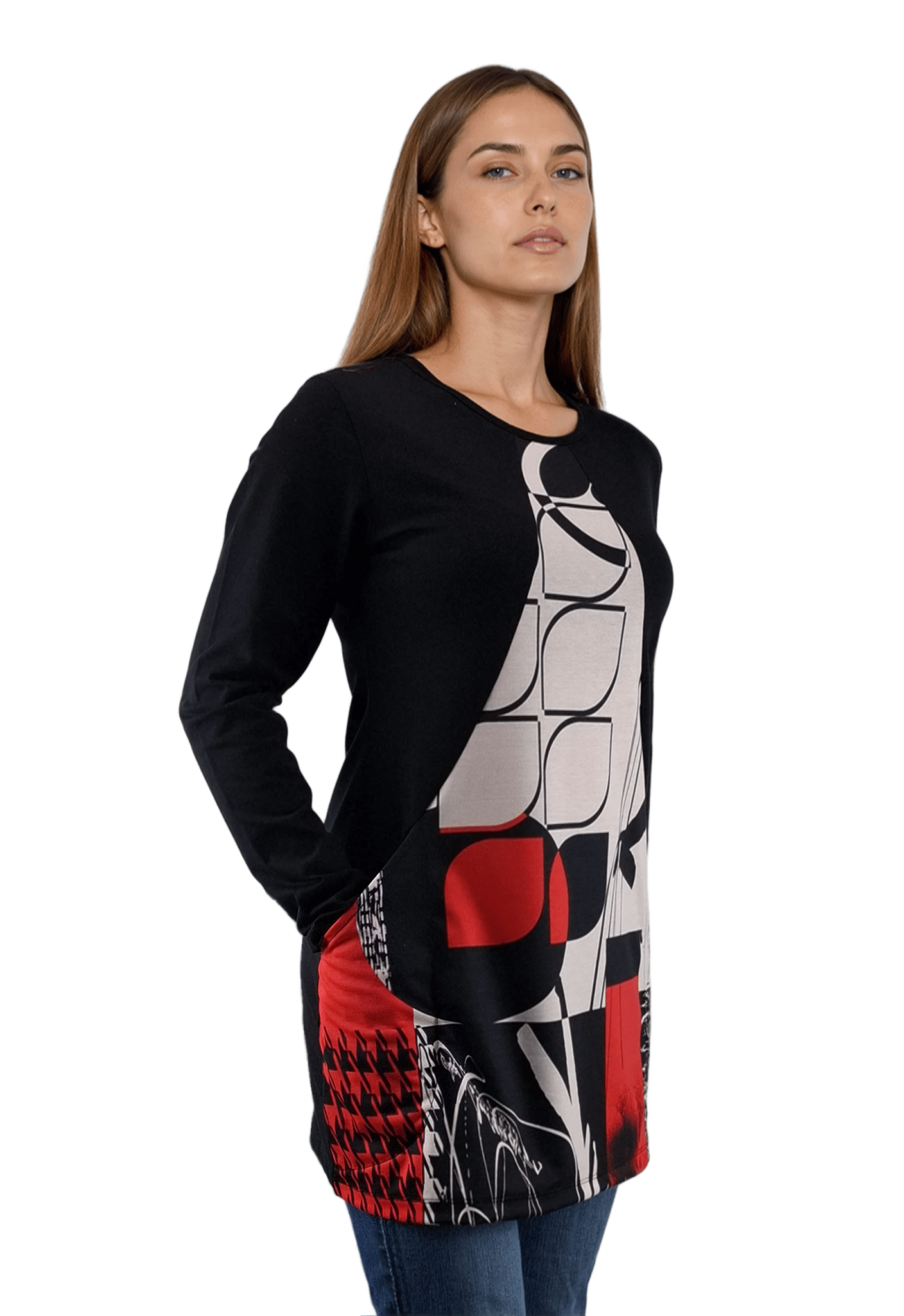 • Bluză-tunică asimetrică pentru femei cu mâneci lungi și decolteu rotund