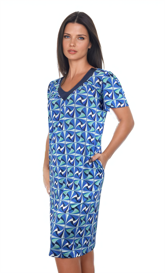 Damenkleid mit kurzen Ärmeln und einem spitzen Ausschnitt